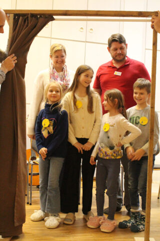 Jede Familie war dann eingeladen, mit Papier und Farben ihr eigenes Familienhaus zu gestalten. Schon beim Basteln der Familienhäuser zeigte sich: Hier geht es nicht nur um Papier und Kleber, sondern um Herzräume und die Frage: Was findet man bei uns, wenn jemand spontan anklopft? Wie offen sind unsere Türen – für Gott, füreinander, für Neues? Beim Improtheater wurde herzlich gelacht, und das Lied „So kommt Gott zu uns“ brachte den Abend auf den Punkt: Gott will bei uns einkehren und uns begegnen – egal, wie es in unserem Inneren gerade aussieht.